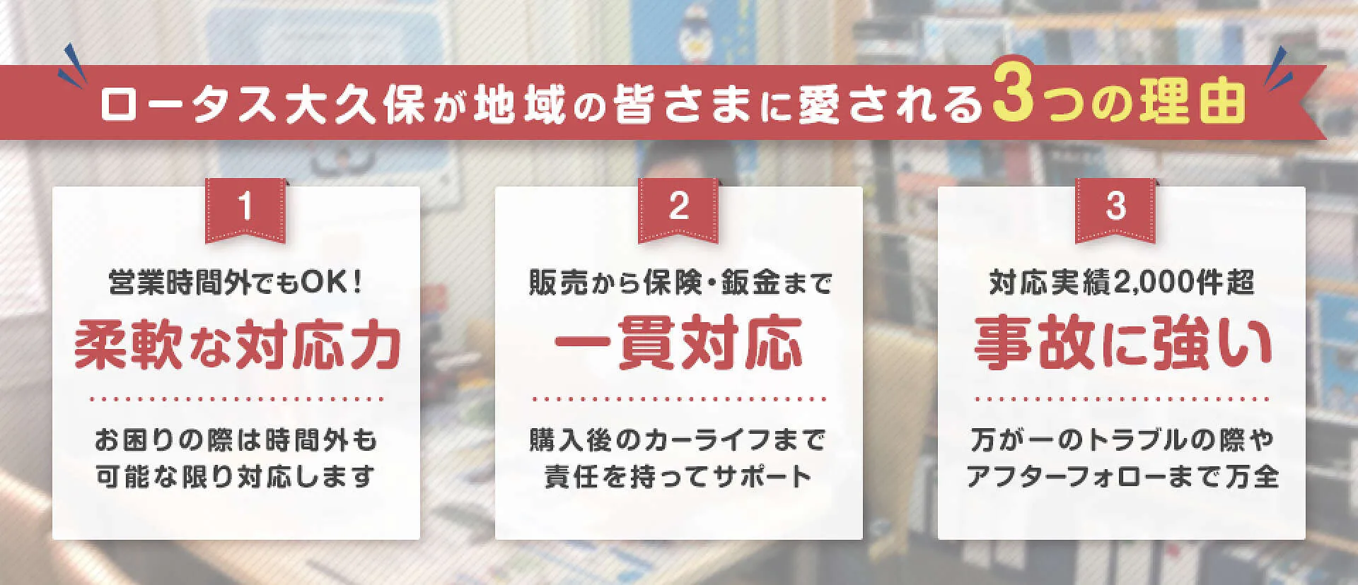 ロータス大久保は、新車・中古車の販売だけで終わらない車屋さんです。